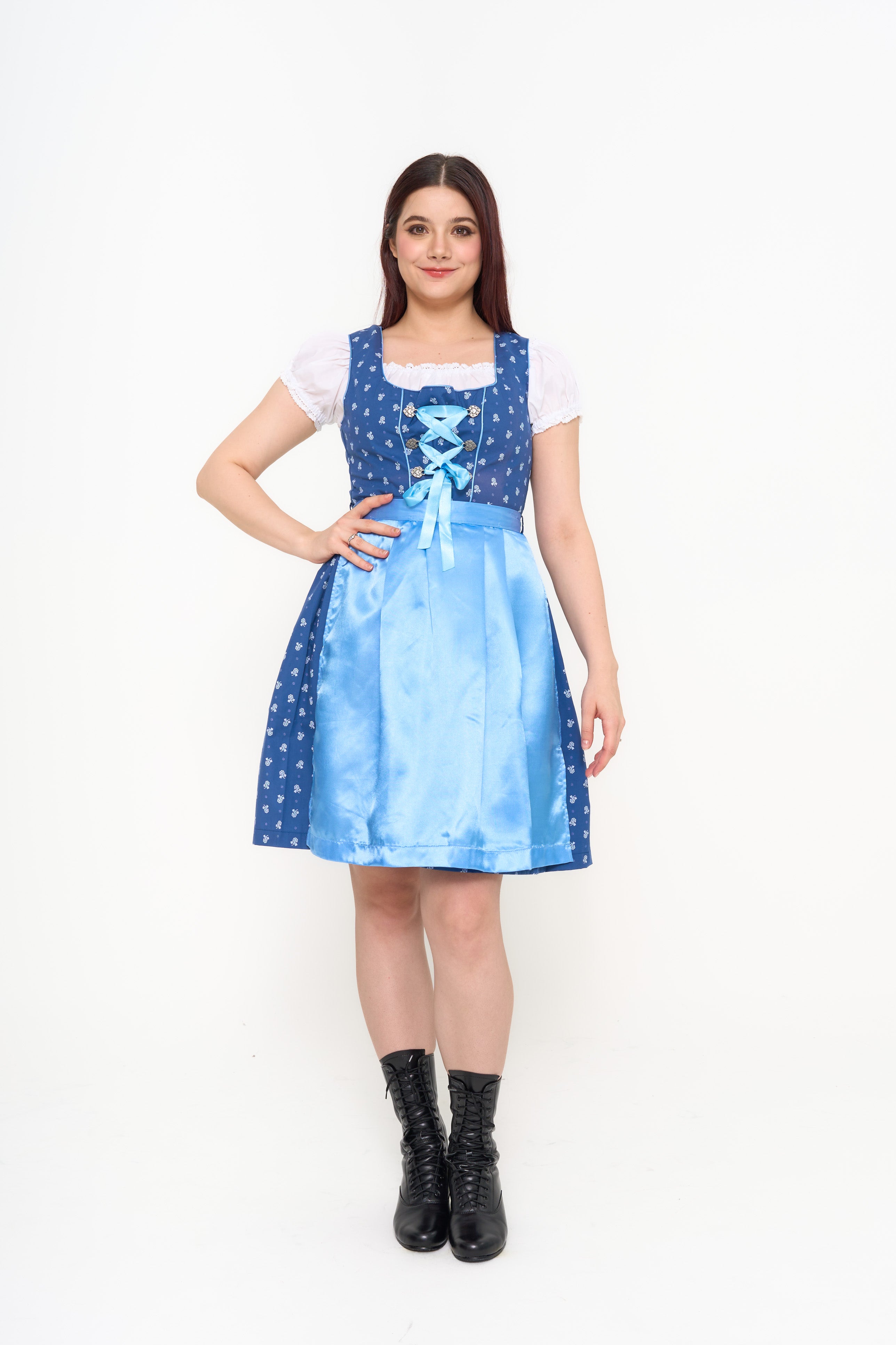 The Dirndl Julia dress blends tradition and elegance, featuring a dark blue dress with delicate white floral patterns, a shimmering light blue satin apron, and a classic white Carmen-style blouse. Its 65 cm skirt includes a practical pocket, while the front zipper and light blue satin lacing ensure a perfect fit.