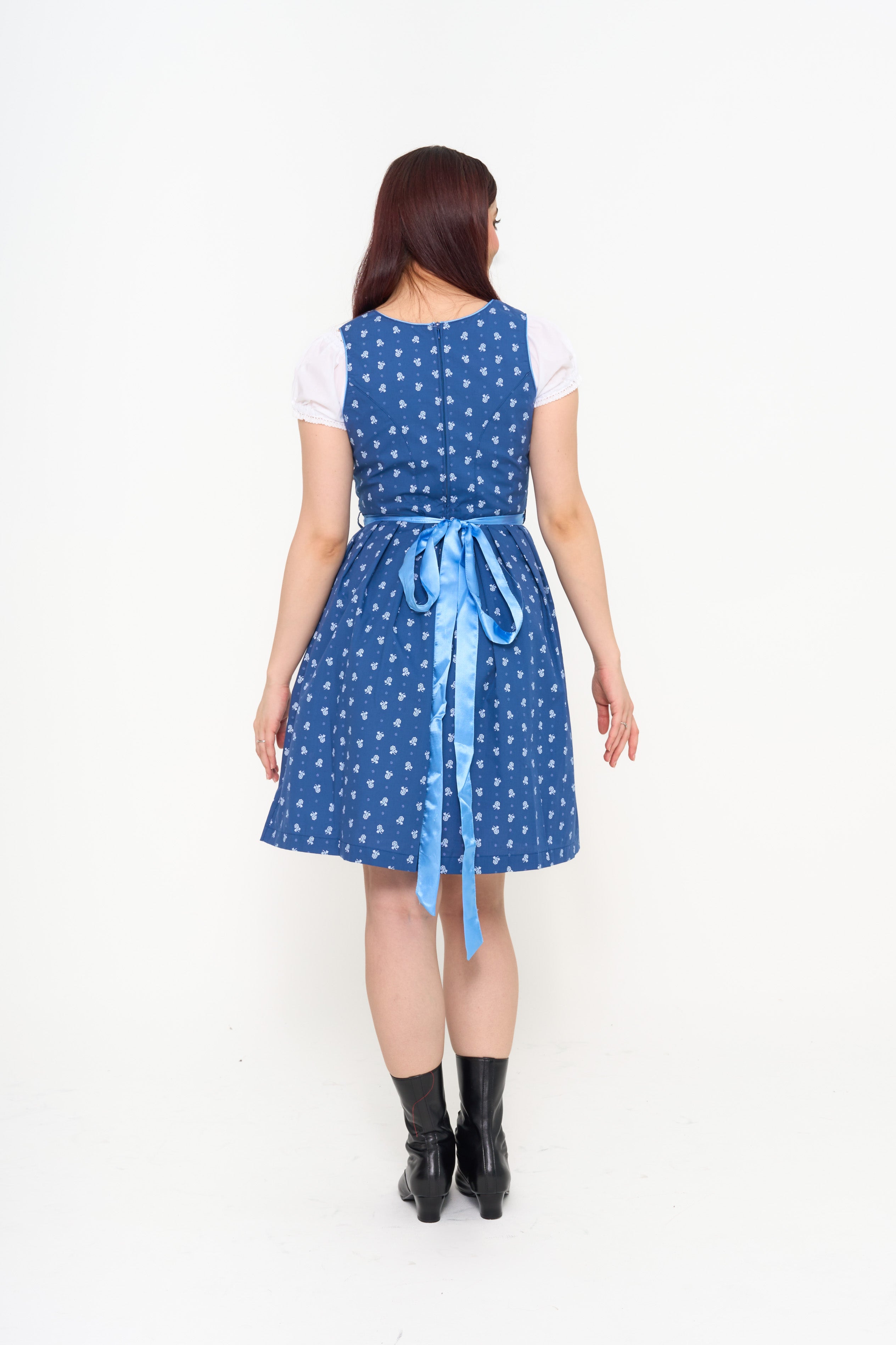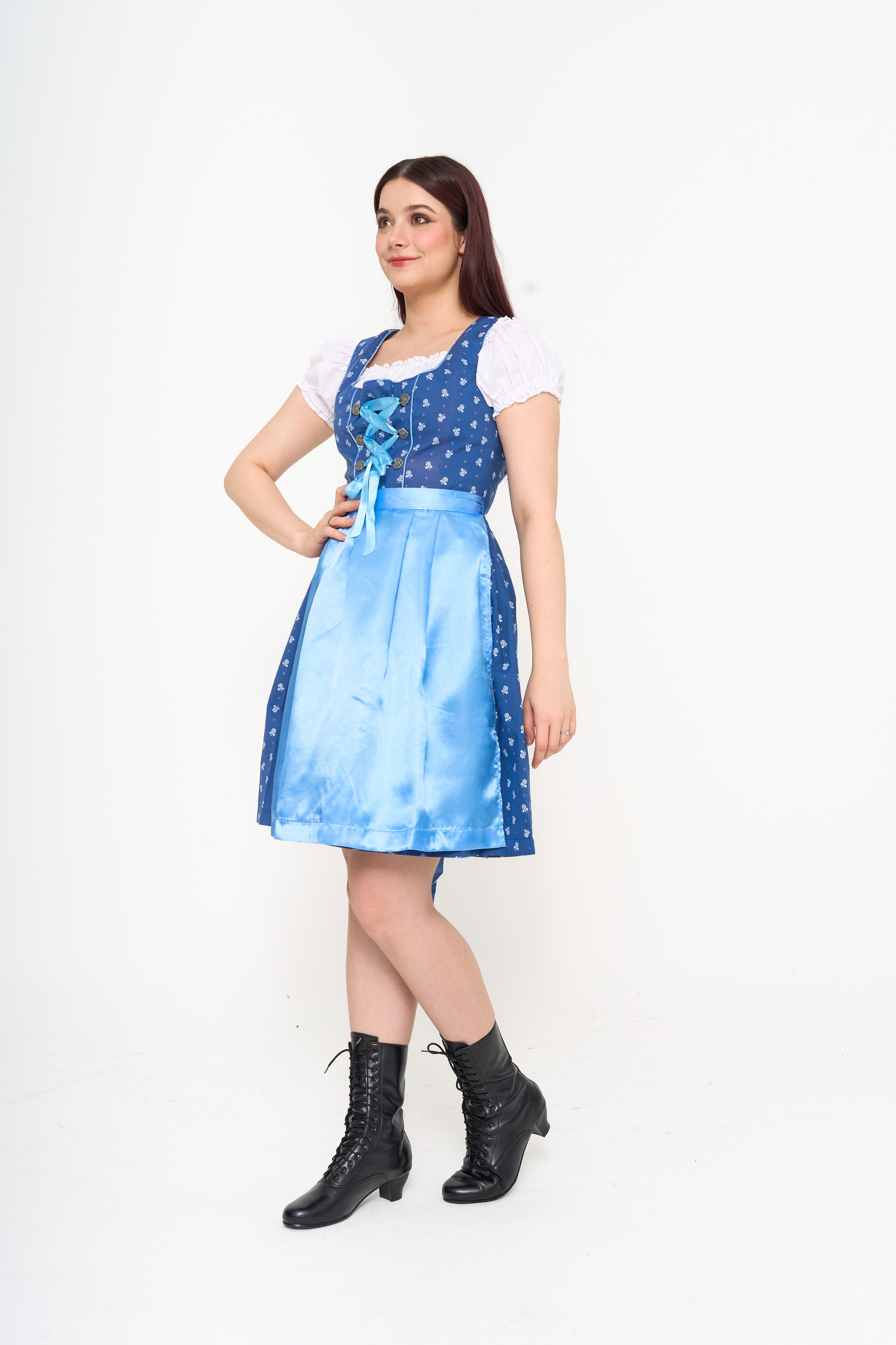 With its timeless design, the white floral accents add a feminine charm, and the satin apron serves as a standout detail. Perfect for weddings, folk festivals, Oktoberfest, and other festive occasions, this dirndl offers both comfort and adjustability.
